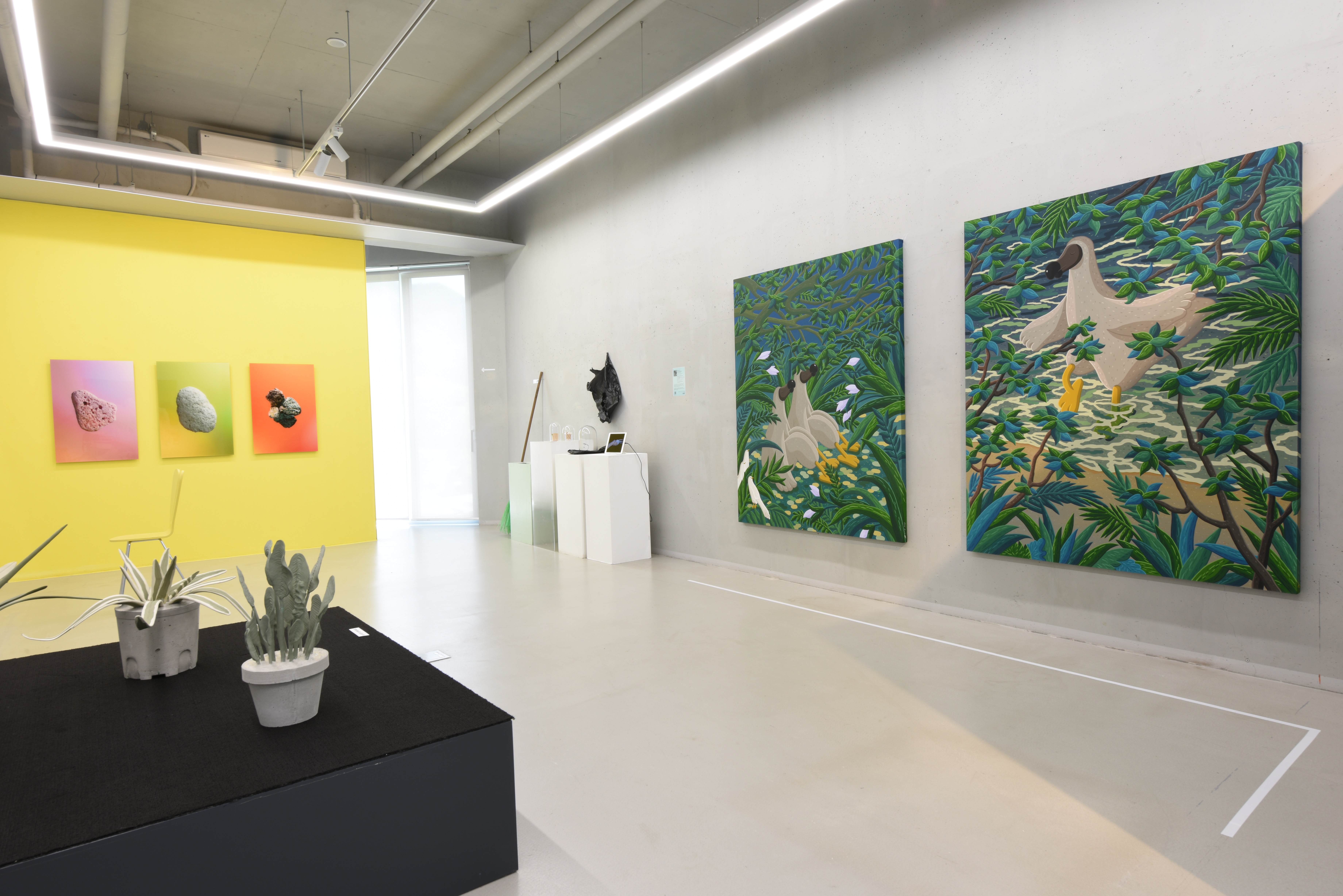 그 안쪽에 있는 이채원 작가의 그림은 사막에서 얼음이 녹아가는 것처럼 보였으며, 마치 삶의 터전을 잃어가는 동물을 암시하는 것 같기도 했다. 옆에 있는 백정기 작가의 작품은 무엇인지 몰라서 더 궁금했다. 알고 보니 전시된 것은 식물이었으며, 변색을 막기 위해 장비를 이용해 에폭시를 집어넣었고 이것이 자원을 막 쓰는 우리의 모습을 암시한다고 했다. 송수영과 박세은, 장한나 작가는 셋 다 사물을 작품으로 제시했는데, 버려지는 것이나 삶의 터전을 잃는 식물을 제시함으로써 인간이 무심코 버리는 물건과 사라져 가는 자연에 대해 많은 생각을 할 수 있었다. 식물 반대편과 송수영 작가의 물건 옆에는 김선우 작가의 그림 2개가 있었다. 이는 도도새의 멸종을 나타내는 그림이며, 생태계의 불확실성을 나타낸다고 했다.