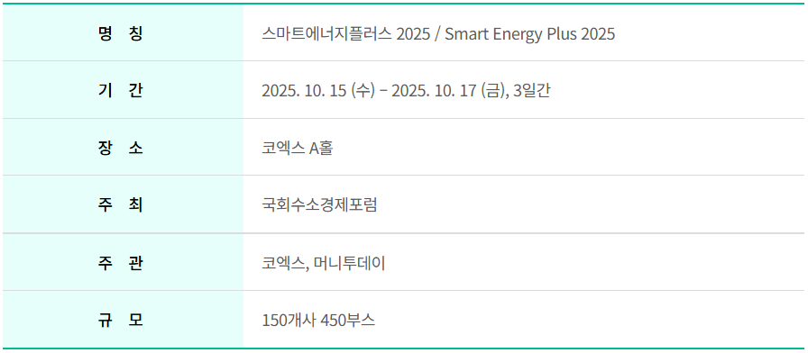 SMART ENERGY PLUS는 수소, 태양광, 풍력, ESS, EMS 등 에너지의 발전-저장-활용 전 과정을 유기적으로 잇는 국내 유일의 에너지 밸류체인 특화 전시회다. 코엑스 A홀에서 2025.10.15(수) ~ 2025.10.17(금)의 기간으로 3일간 진행되며, 국회수소경제포럼이 주최하고, 머니투데이와 코엑스가 주관한다. 150개사가 참여하고 450개의 부스가 운영된다. 전시회 품목으로는 크게 에너지 발전, 에너지 저장, 에너지 활용으로 3가지 부문이다.