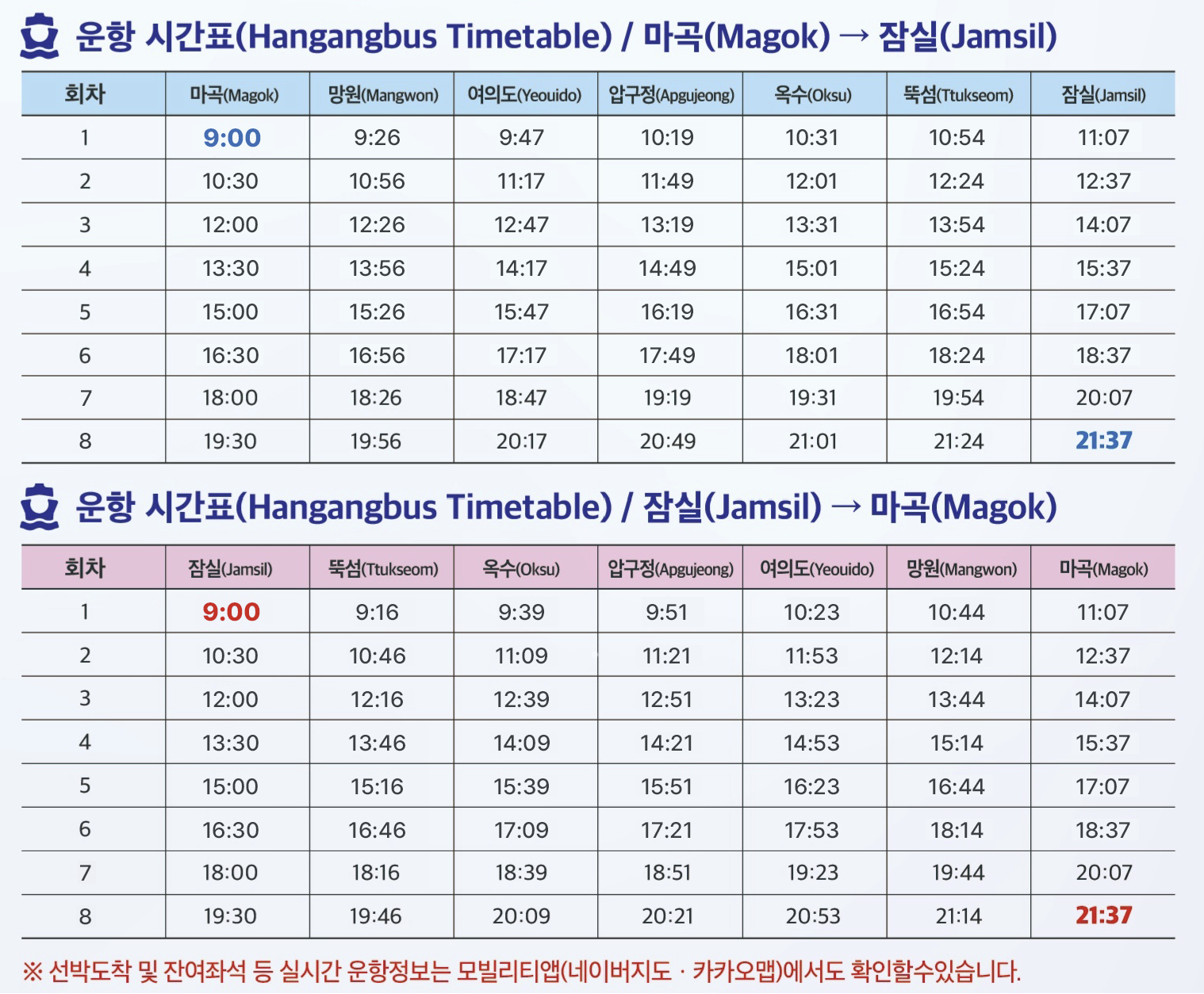 1) 한강버스 홈페이지, "이용안내" https://www.hgbus.co.kr/itc/information/schedule?menuId=5