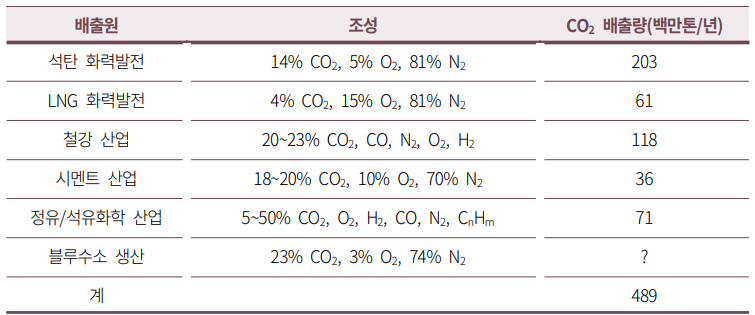 [자료 1. 산업분야별 CO2 배출원 및 배출농도, 배출공정]