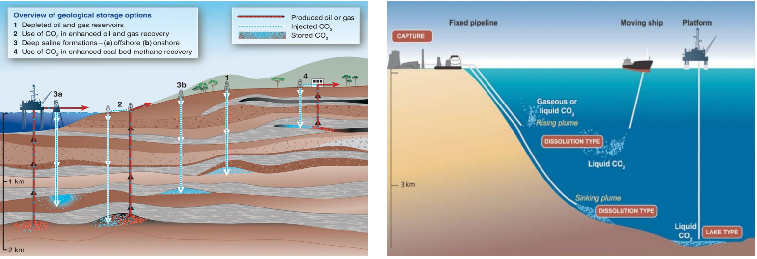 CCS는 포집된 이산화탄소를 장기적으로 안전하게 저장하는 기술이다. 지중 저장과 해양 저장 방식으로 구분되며, 지하의 대염수층이나 고갈된 가스전, 유전 등 지질 구조 내에 이산화탄소를 주입하여 영구적으로 저장하는 방식을 취한다. CCS 기술에는 고갈된 유전이나 가스전, 석탄층 등 이산화탄소를 저장할 수 있는 저장 공간 확보가 중요시되며, 그에 따라 화석연료 생산국이 이산화탄소 저장 공간 확보에 유리하다는 특징이 있다.