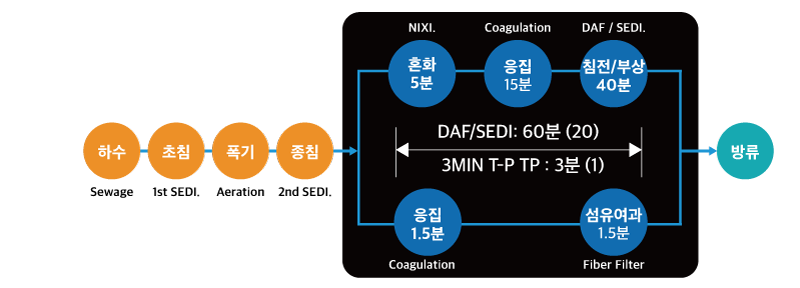 3 Min T_P TP : 생의 '3분 총인처리공정'은 생물학적 하수처리수에 응집제를 가해 인을 응집하여 중력식섬유여과기(GFF)로 직여과하는 SMiF(Single Mixing &Filtering)공정이다. 3분 이내에 총인처리가 완료되어 1시간여가 소요되는 응집부상법과 응집침전법 대비 1/20 크기로 건설기간이 짧고 건설비와 운전비가 낮다. 원수 총인 2ppm일때 처리수 0.2, 0.3, 0.5ppm등 기준이내로 처리된다.