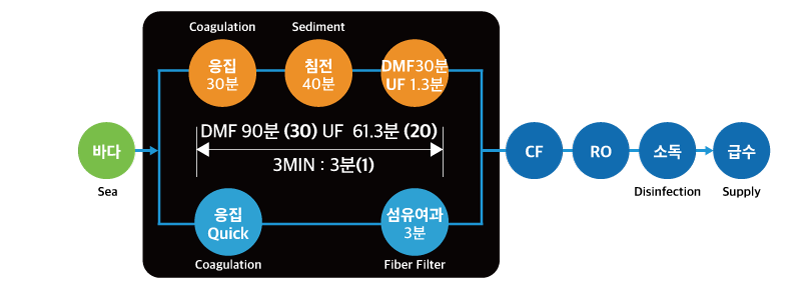 3 Min RO PTP : 생의 '3분 RO전처리공정'은 원수와 응집제를 라인믹서로 급속혼화하여 미세섬유여과기(PCF)로 직여과하는 SMiF(Single Mixing &Filtering)공정이다. 3분이내에 RO전처리가 완료되어 응집 침전공정을 포함하여 약1시간이 소요되는 UF법의 1/20, 약1.5시간이 소요되는 DMF법의 1/30의 크기로 건설기간이 짧고 건설비와 운영비가 낮다. 원수 20NTU일때 처리수 탁도-0.1NTU, SDI15-3.0내외로 처리된다.
